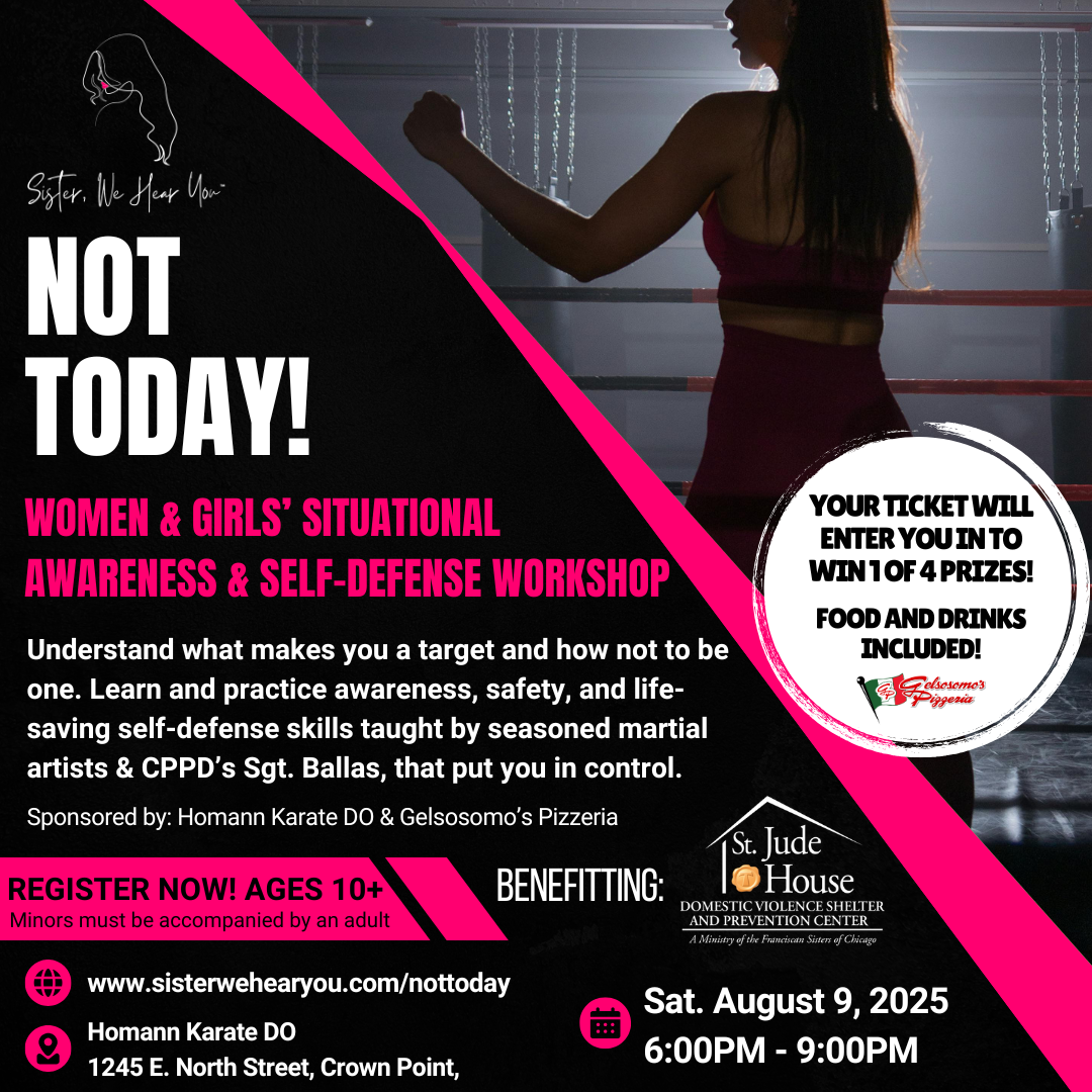 Not Today! is a Women & Girls’ Situational Awareness and Self-Defense Workshop presented by Sister, We Hear You and benefitting St. Jude House, Domestic Violence Center in Crown Point, IN.